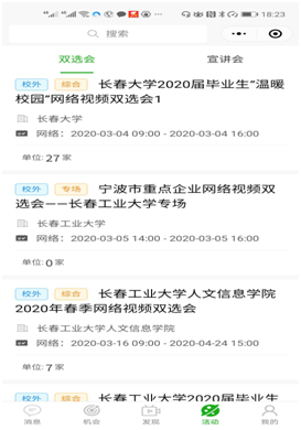 1. 入口:小程序“活动-双选会”栏目中查看网络视频双选会,双选会默认显示本校活动,登录后可以查看校外网络视频双选会并入场参会。