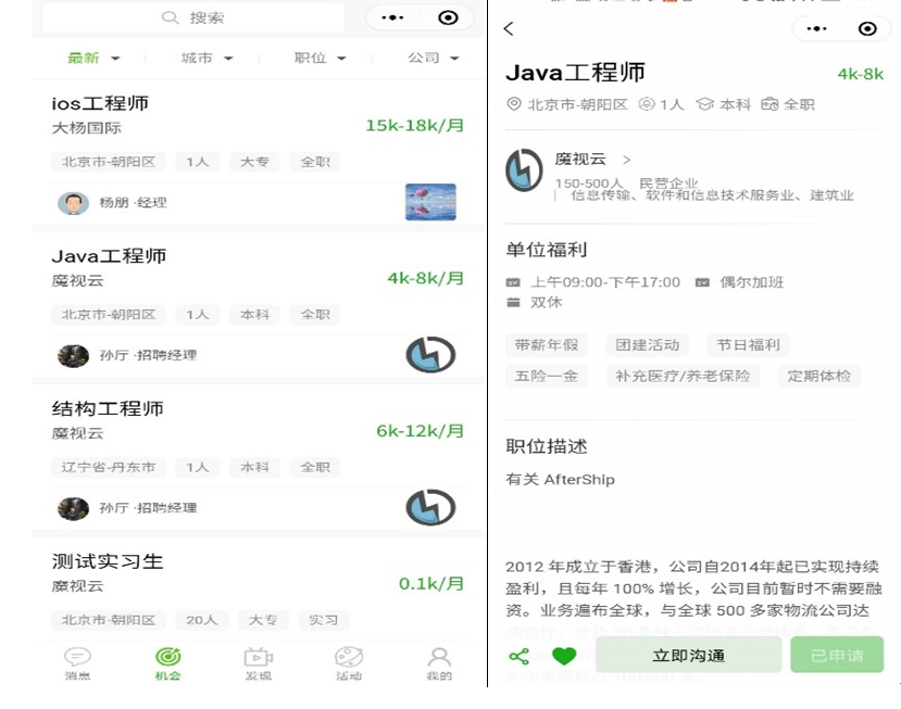 2. 求职面试:查找企业发布的职位信息,登录状态下平台将为学生匹配工作机会,查看匹配的岗位请选择左上角“推荐”,感兴趣请点击列表查看职位详情,点击立即沟通,可以与发布该职位的HR直接沟通,聊得好由HR发起视频面试。