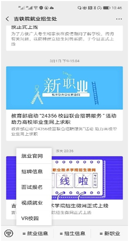 1) 请扫码关注我校就业微信公众号“吉铁院就业”,点击“就业信息-视频就业“,点击“我的”,进入我校学生就业小程序。