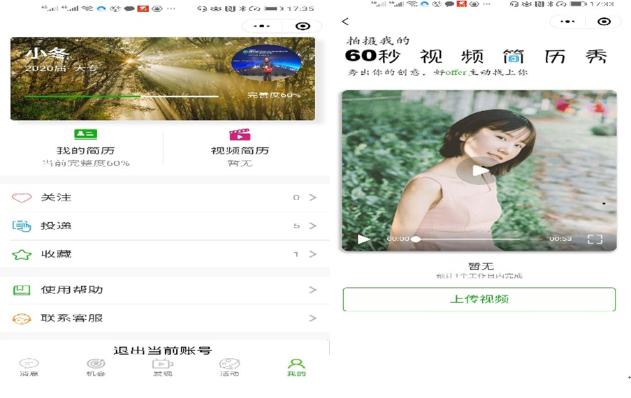 学生在小程序激活账号后,可以在小程序编辑文字、录制上传视频简历,同时可以在PC端编辑完善文字简历。