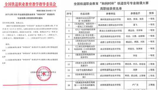 2020年12月11日全国铁道职业教育“和利时杯”铁道信号专业微课大赛成果揭晓,高铁综合技术学院选送的作品,获得一等奖1项,二等奖1项,三等奖1项。本次大赛由全国铁道职业教育教学指导委员会主办,铁道通信信号专业教学指导委员会、北京和利时系统工程有限公司等单位具体承办,共有38家全国知名铁道类职业技术学院和16家铁路局集团公司加了本次大赛。