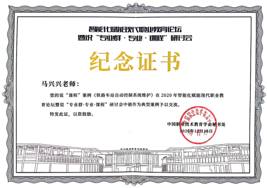 2020年12月18日,为学习贯彻全国教育大会精神,落实《国家职业教育改革实施方案》和国家“双高”建设计划,推动高职教育专业群、专业、课程的建设发展,推进“三教”改革,中国职业技术教育学会举办了智能化赋能现代高职教育论坛暨说“专业群·专业·课程”研讨会,我校教师马兴兴的说“课程”《铁路信号自动控制系统维护》被评为典型案例予以交流。