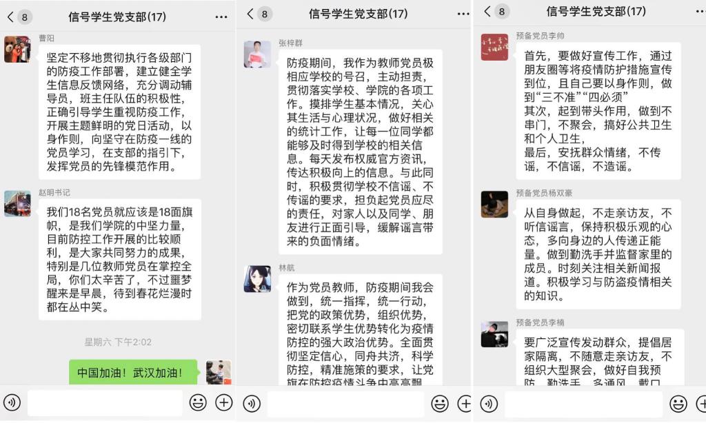 教师党员表示,要以高度的政治责任感,以身作则认真贯彻执行各级部门的防疫工作部署,建立健全信息反馈网络,充分调动辅导员,班主任,学生干部队伍的积极性,把广大学生凝聚起来、组织起来、带动起来,以对党和学生高度负责的态度,全力打好这场疫情防控阻击战。