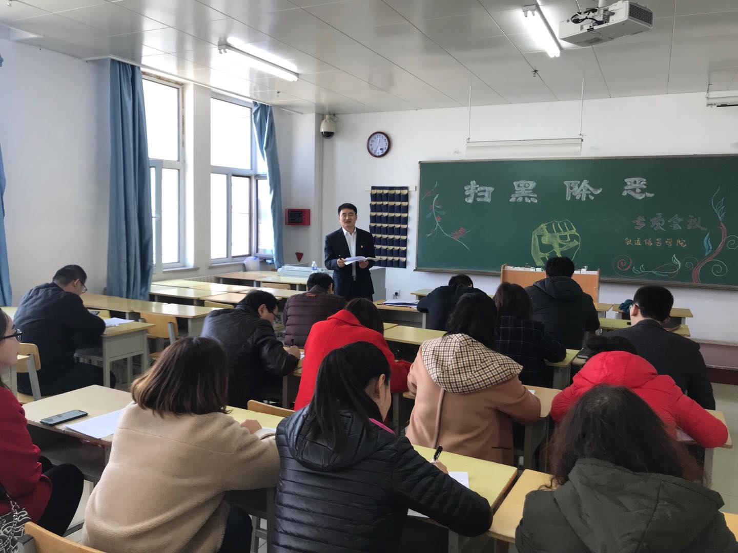 会上分院党总支书记郝延春向全体教师传达学院吉铁职院发《2019》27号文件,同时对分院内工作再次做了详细的部署落实,完善《铁道信号学院扫黑除恶专项斗争工作方案》,成立扫黑除恶专项斗争领导小组,明确责任分工。强调各支部、学生管理、团委要结合工作实际,认真组织,紧密配合,有效地推进相关工作,把工作做实;要加大宣传力度,做到无死角。