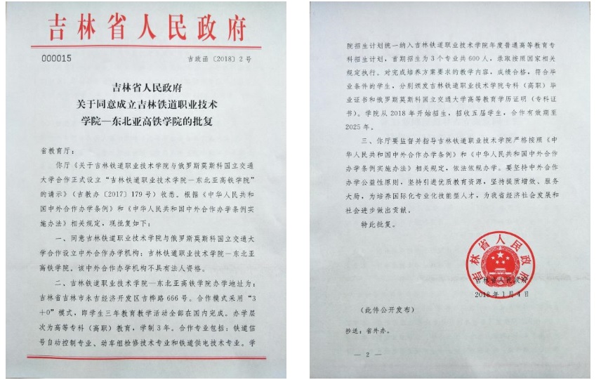 吉铁院中外合作办学机构——东北亚高铁学院,在全院上下共同努力下,在省教育厅的大力支持下,在省政府的亲切关怀下,于2018年1月4日获得吉林省人民政府批复。