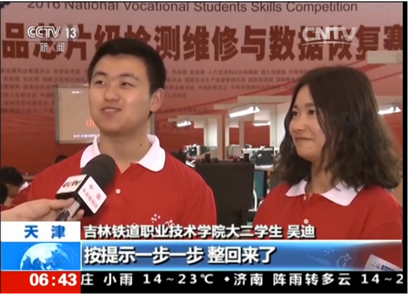 赛后两位选手一同接受了中央电视台新闻频道记者的采访,尽管有成绩不如预期理想的小小遗憾,但谈到大赛两位选手还是很兴奋,“同学的U盘文件丢了,我帮她找了回来。”接触电子产品芯片级检测维修与数据恢复不久的张艳雪说道。“挺简单的,需要10分钟吧!”问及恢复故障数据需要多长时间的时候,吴敌自信满满的说。