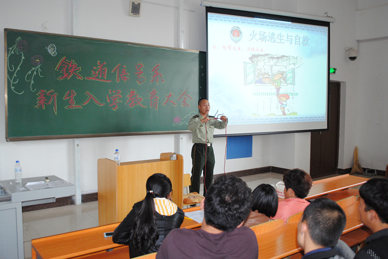 2014年9月26日下午13:30,铁道信号系联合院保卫处在教学楼西401阶梯教室,召开新生入学教育暨安全消防教育讲座。本次讲座特别邀请到了吉林市消防支队消防调度指挥中心值班长戴维尔警官;学院保卫处综合管理科科长吴琼。铁道信号系党总支书记林红东、系学办主任于威、系团委书记王婧婧以及辅导员老师参加了讲座。本次讲座主要分为三个部分:第一,大学生校园安全知识;第二,消防安全常识;第三,大学生日常管理各项要求。本次会议由王婧婧主持。