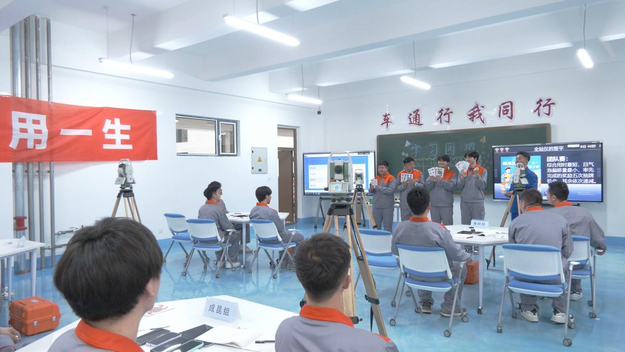本次样板分享课由高铁综合技术学院青年教师刘征主讲,课程内容聚焦《全站仪整平》的核心章节与核心能力。刘征老师以“问题链”贯穿教学主线,通过“案例导入—分组探究—成果分享—总结拓展”四步教学法,将抽象理论转化为贴近现实的实践议题。课堂伊始,他以别开生面的“团队握手激励仪式”破冰,在知识复习环节,六道全站仪操作核心问题通过“随机抽题+限时抢答”模式展开,课程创新引入“卡牌”奖励机制,进一步激发学生的学习兴趣及对知识的渴望,随后组织小组围绕“全站仪整平解决方案”展开讨论,通过科学性、效率性、创新性、可操作性四个维度,组织学生完成“自评+互评+AI助评”。