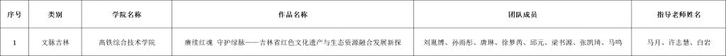 根据《关于组织开展吉林铁道职业技术学院2025年“挑战杯”大学生课外学术科技作品竞赛的通知》要求,学院按照赛制组织了高铁综合技术学院2025年“挑战杯”大学生课外学术科技作品竞赛“文脉吉林”社会调查专项赛。通过自愿申报、组织评审组评审,根据评审意见,拟推报1个项目参加校赛,现予公示: