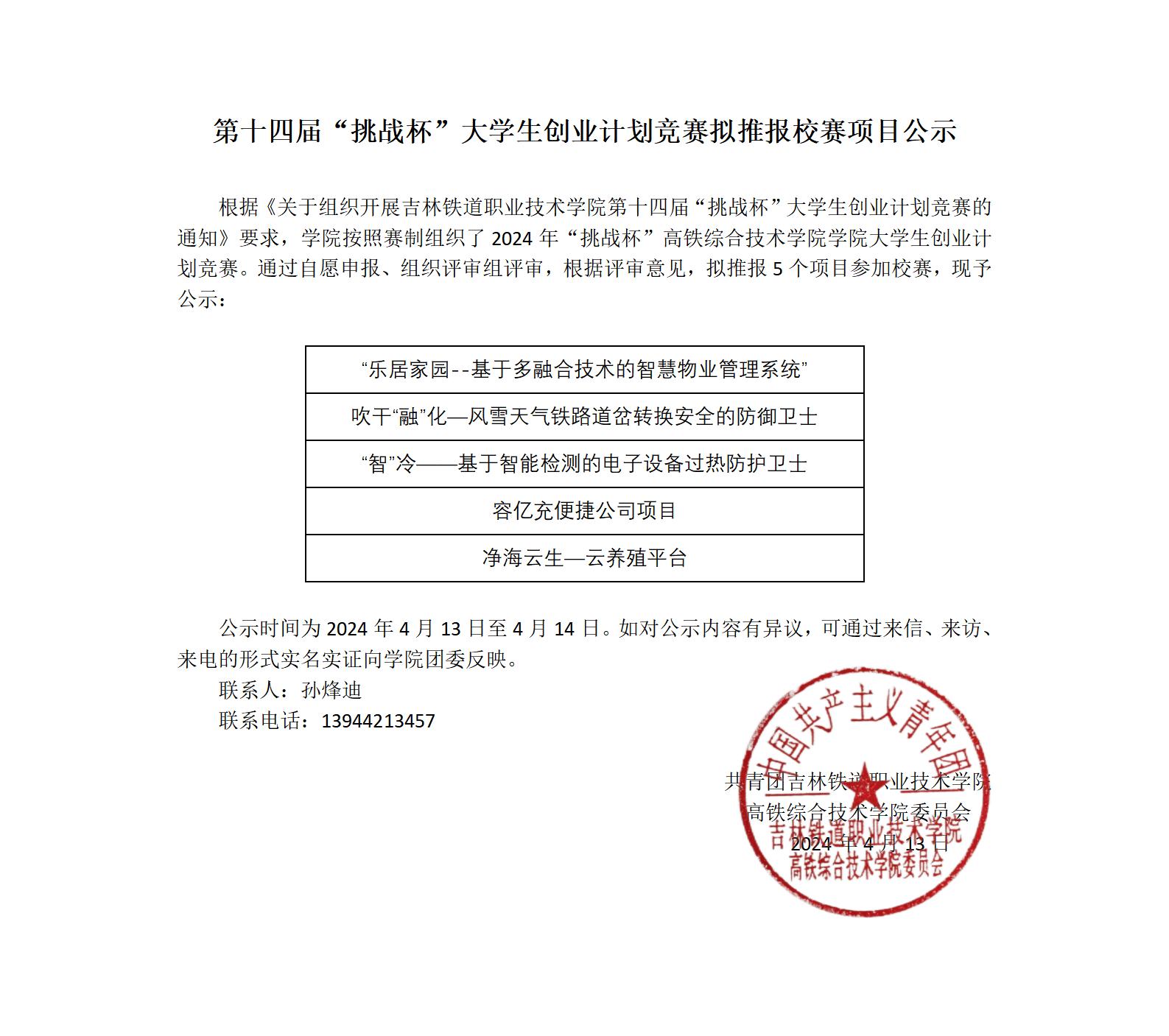 经过数月的紧张筹备和激烈角逐,吉林铁道职业技术学院高铁综合技术学院2024年“挑战杯”大学生创新创业大赛在教学楼513成功举办并圆满结束。受邀作为本次院赛的评委有高铁综合技术学院孙烽迪老师、郐洪杰老师、张越老师。本次院赛旨在激发学生的创新创业潜能、培养团队协作能力,并为同学们搭建展示自我、交流科创成果的平台。