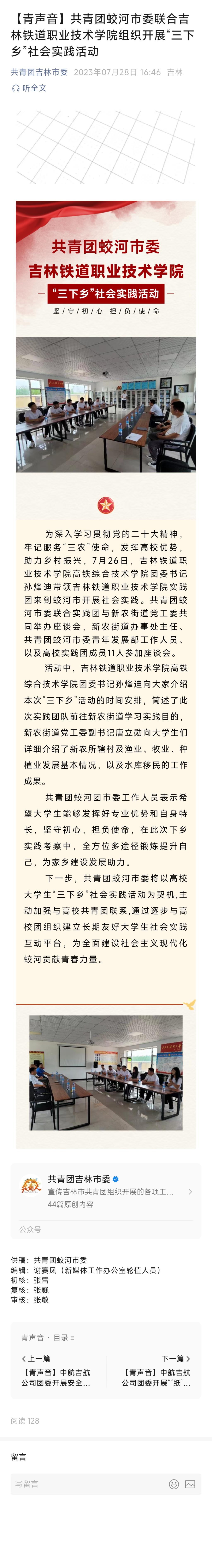 为深入学习贯彻党的二十大精神牢记服务“三农”使命,发挥高校优势助力乡村振兴,7月26日,吉林铁道职业技术学院高铁综合技术学院团委书记孙烽迪带领吉林铁道职业技术学院实践团来到蛟河市开展社会实践。共青团蛟河市委联合实践团与新农街道党工委共同举办座谈会,新农街道办事处主任共青团蛟河市委青年发展部工作人员以及高校实践团成员11人参加座谈会。