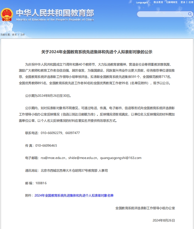 近日,教育部发布《关于2024年全国教育系统先进集体和先进个人拟表彰对象的公示》,为庆祝中华人民共和国成立75周年和第40个教师节,大力弘扬教育家精神,营造全社会尊师重教浓厚氛围,激励...